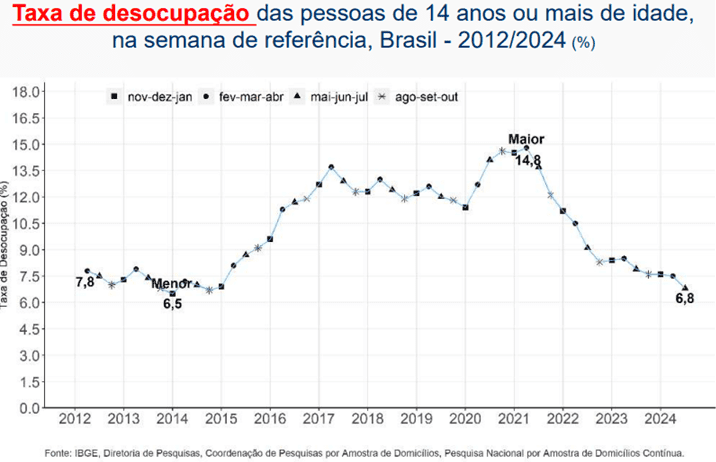 A menor taxa de desemprego de toda a série histórica foi registrada em 2014, quando chegou a 6,5%.